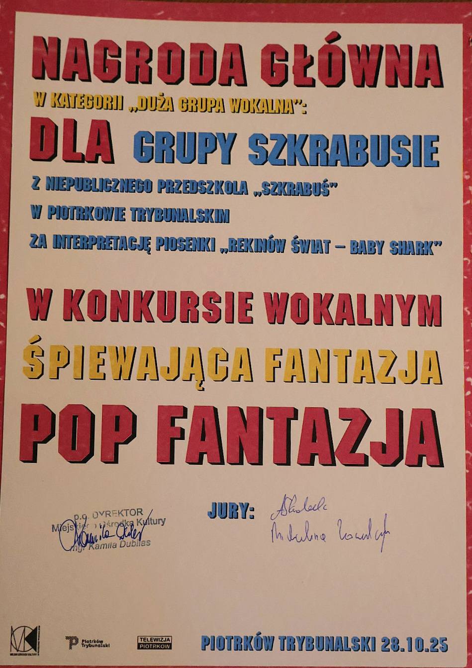 Z ogromną radością i dumą informujemy, że nasze Szkrabusie zdobyły nagrodę główną w konkursie “Pop Fantazja” za interpretację piosenki “Baby shark – rekinów świat” 🦈🏆